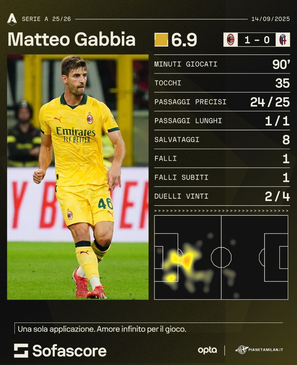 90 minuti in campo per Matteo Gabbia con 35 tocchi e 24 passaggi precisi e un passaggio lungo completato. Ben 8 salvataggio, un fallo commesso e uno subito. Due duelli vinti su 4.