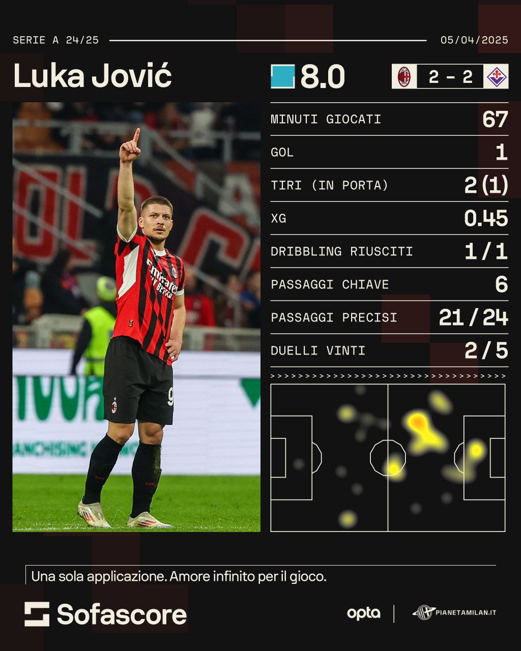 Andiamo a vedere la sua prestazione contro la Fiorentina grazie ai numeri e alle statistiche di 'Opta' e 'Sofascore' per PianetaMilan. 67 minuti giocati, un gol e un XG di 0.45. Un dribbling tentato e 6 passaggi chiavi. 21 passaggi precisi riusciti e 2 duelli vinti. Come possiamo vedere dalla heatmap, Jovic si è mosso per tutto il campo.