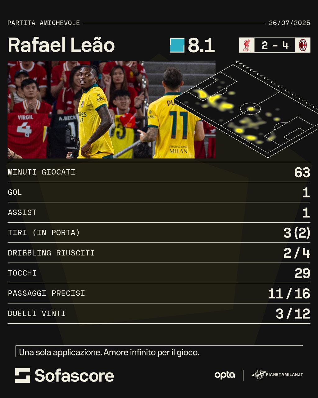 Andiamo a vedere la sua prestazione contro il Liverpool grazie ai numeri e alle statistiche di 'Opta' e 'Sofascore' per PianetaMilan. Per Leao 63 minuti in campo. Un gol, un assist, tre tiri di cui due in porta, 2 dribbling riusciti su quattro, 29 tocchi. 11 passaggi riusciti e 3 duelli vinti. Dalla heatmap possiamo vedere come Leao abbia giocato si sulla sinistra, ma più verso il centro sinistra che sulla fascia. Un segnale, forse, almeno con la difesa a tre: Rafa con Allegri gioca più al centro del passato e sfrutta quello che sa fare meglio, ovvero correre in campo aperto, saltare gli avversari e creare pericoli per le difese avversarie.