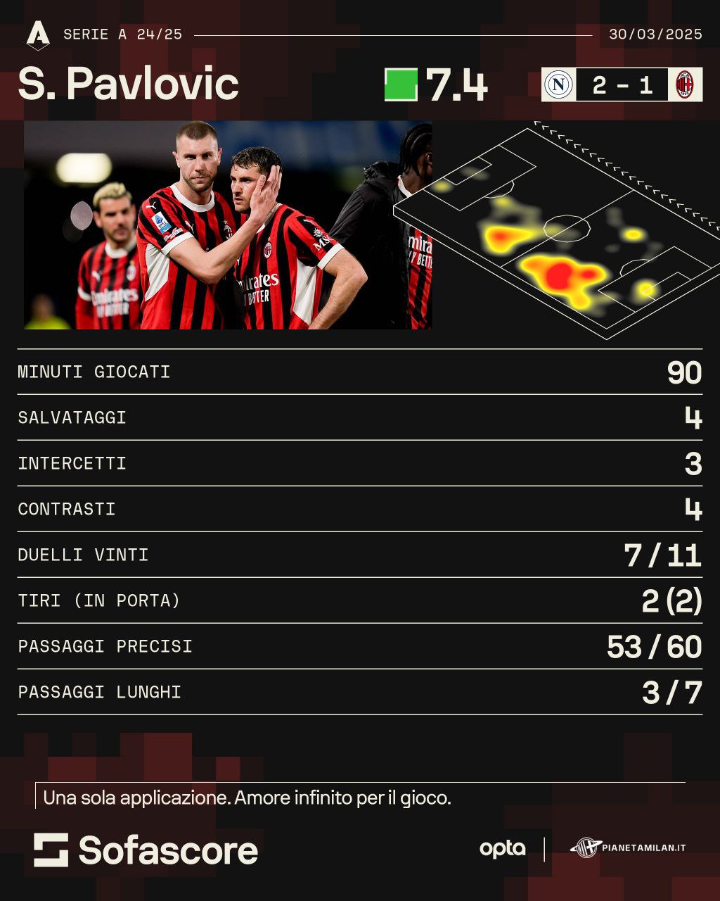 Andiamo a vedere le loro prestazioni contro il Napoli grazie ai numeri e alle statistiche di 'Opta' e 'Sofascore' per PianetaMilan. 4 salvataggi, 3 intercetti e 4 contrasti con 7 duelli vinti su 11. Numeri che sulla carta sembrano anche positivi, ma Pavlovic ha sbagliato tantissimo contro il Napoli, tanto che sorgono dubbi sul futuro del reparto rossonero.