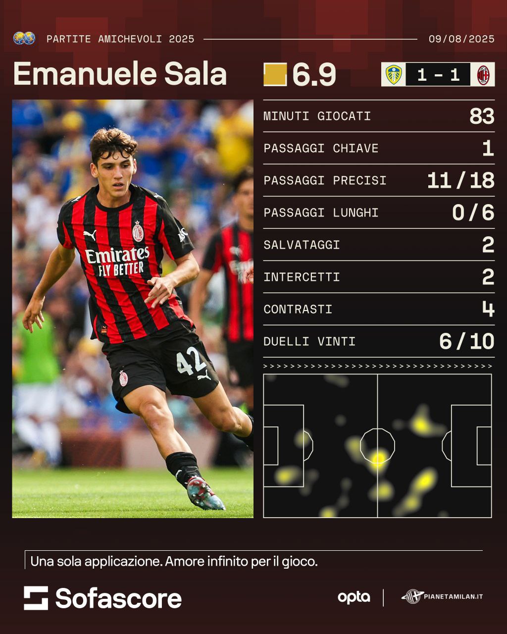 Andiamo a vedere la sua prestazione contro il Leeds grazie ai numeri e alle statistiche di 'Opta' e 'Sofascore' per PianetaMilan. 83 minuti per il giovane Sala. Un passaggio chiave, 11 passaggi precisi e zero passaggi lunghi. 2 salvataggi, 2 intercetti e 4 contrasti. 6 duelli vinti su 10. Dalla heatmap possiamo vedere come abbia giocato praticamente su tutto il campo. La giocata più bella della sua partita è stato un passaggio filtrante bellissimo per Santiago Gimenez a tagliare in due la difesa del Leeds.