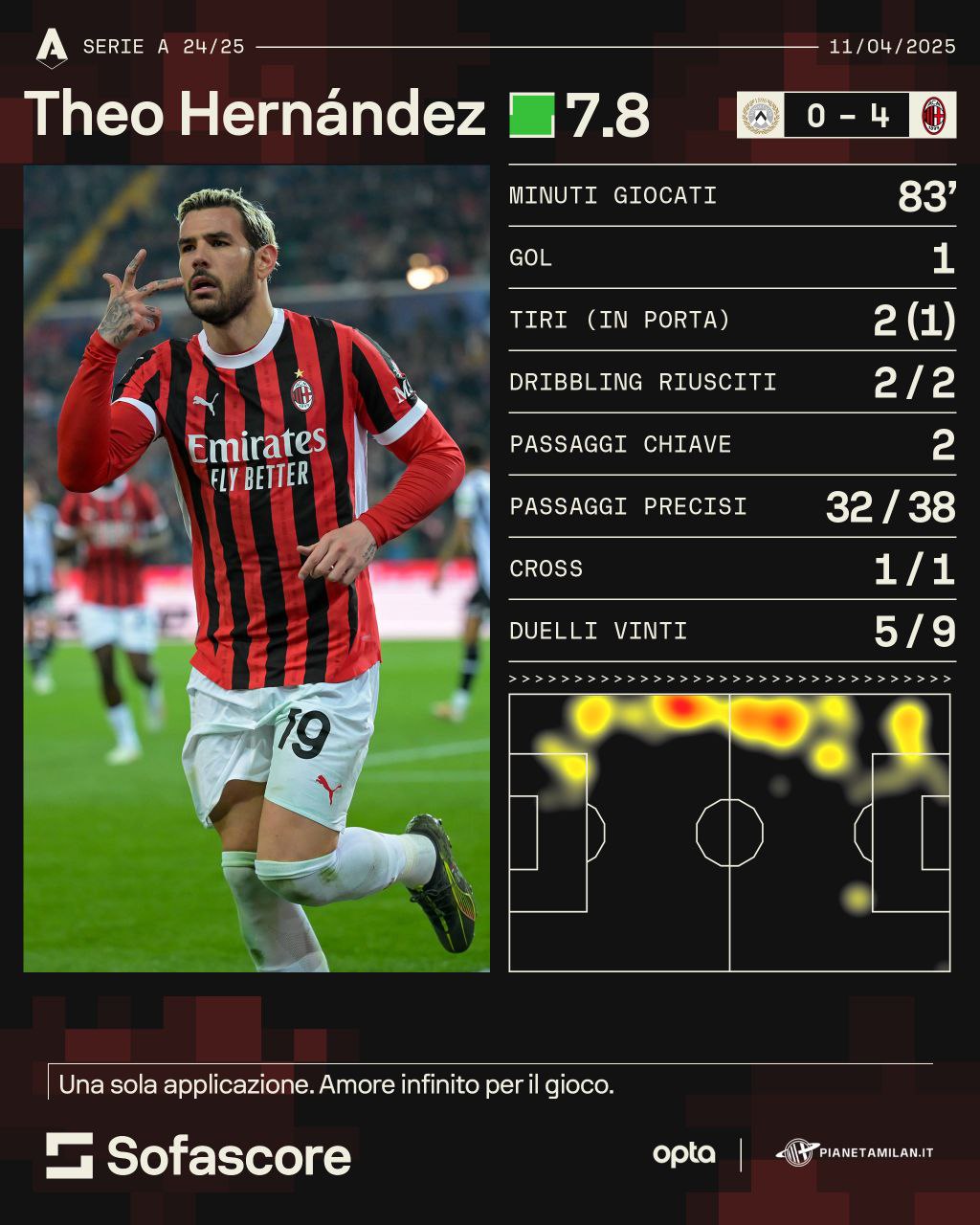 Andiamo a vedere la sua prestazione contro l'Udinese grazie ai numeri e alle statistiche di 'Opta' e 'Sofascore' per PianetaMilan. 83 minuti giocati, un gol con due tiri di cui uno in porta. 2 dribbling riusciti sui due tentati, due passaggi chiave e 32 passaggi precisi sui 38 tentati. 5 duelli vinti su 9.