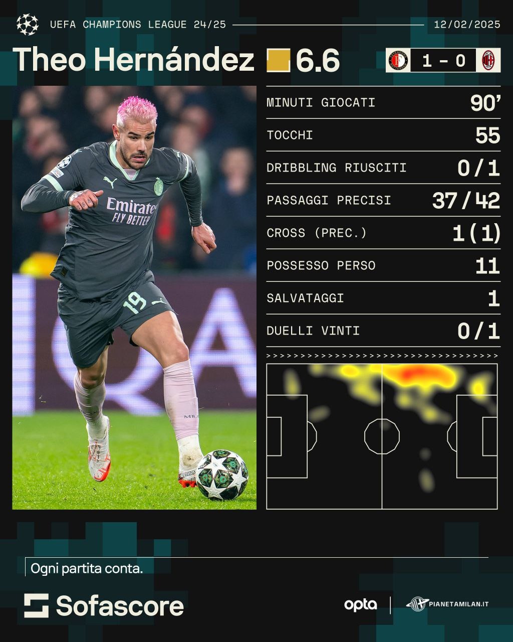 Voti molto insufficienti per Theo Hernandez, che sicuramente non è stato al massimo della sua forma, ma non ha giocato poi così male da meritare queste pagelle. Andiamo a vedere la sua prestazione grazie ai numeri e alle statistiche di 'Opta' e 'Sofascore' per PianetaMilan.