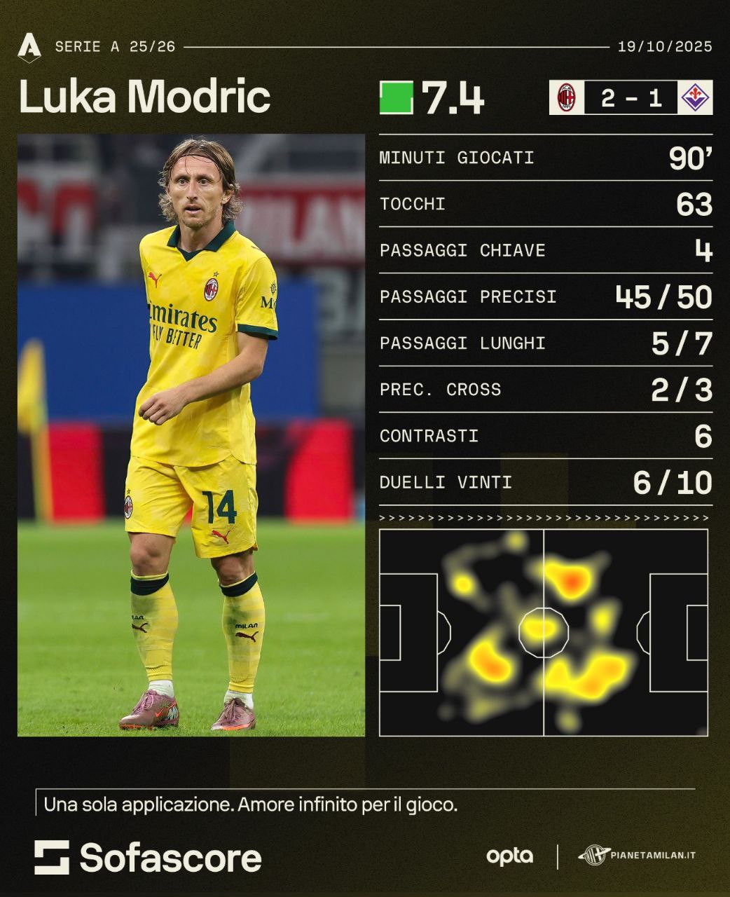 Altra gara dal primo all'ultimo minuto per Luka Modric con il Milan. 63 tocchi, 4 passaggi chiave, 45 passaggi precisi riusciti su 50. 5 passaggi lunghi su 7. Due cross precisi su 3. Sei contrasti e 6 duelli vinti su dieci. Come possiamo vedere dalla heatmap, Modric ha giocato praticamente a tutto campo contro la Fiorentina. Altra partita totale quella di Luka Modric contro la Fiorentina. Ormai non fa più notizia, ma il croato è uno di quelli che corre di più in campo, che ci mette più grinta dei 22 uomini sul rettangolo di gioco. Contro la viola non ha spiccato per la sua qualità di gioco e la sua visione, ma si è reso utile in tante piccole parti importanti. Pressing, recuperi del pallone, grinta. Una partita di 'sacrificio' per Modric. Segno che la voglia di vincere c'è ancora.