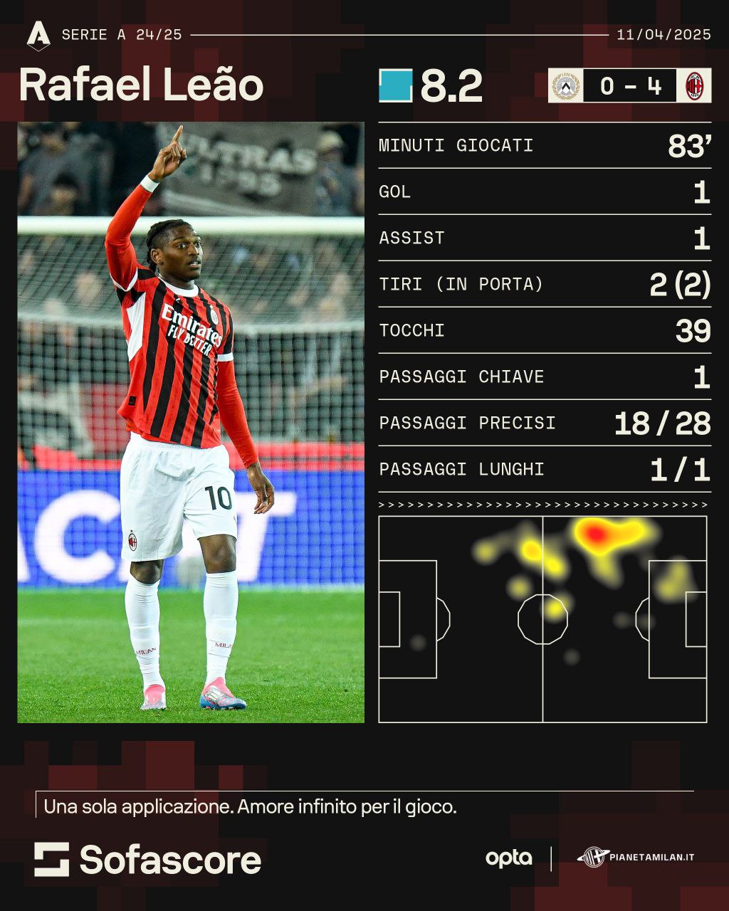 Andiamo a vedere la sua prestazione contro l'Udinese grazie ai numeri e alle statistiche di 'Opta' e 'Sofascore' per PianetaMilan. 83 minuti giocati, un gol, un assist con 2 tiri in porta, 39 tocchi, un passaggio chiave e 18 passaggi precisi riusciti.