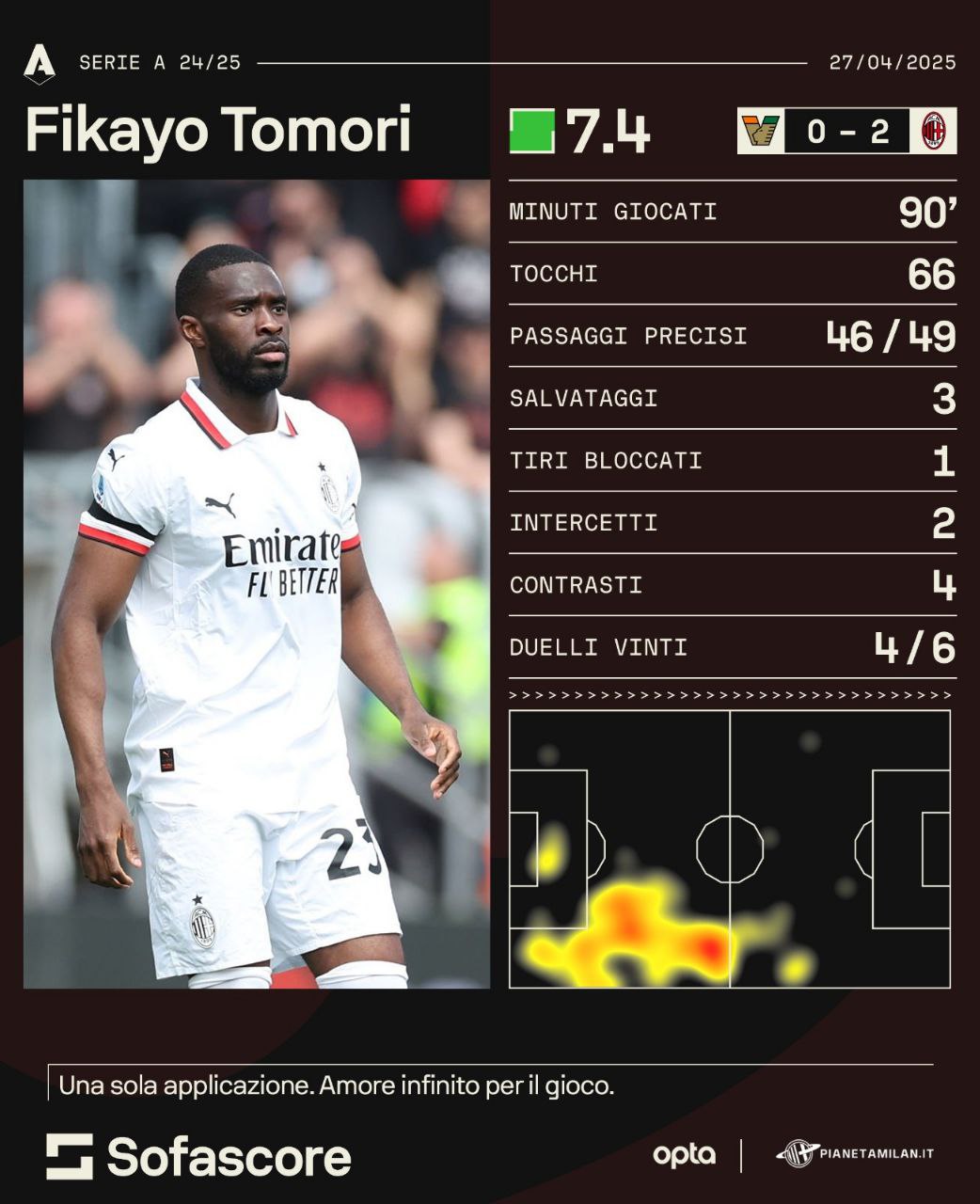 Questi i numeri molto importanti di Tomori. Il difensore inglese è tornato di nuovo al centro del Milan di Conceicao in una stagione da montagne russe. Prima titolare, poi quarta scelta con Fonseca, poi di nuovo titolare con Conceicao, di nuovo quarta scelta e di nuovo titolare con la difesa a tre. Ed è proprio il cambio tattico che potrebbe cambiare il destino di Tomori. Secondo le ultime news di calciomercato, l'inglese potrebbe partire per magari tornare in patria. Ma davvero serve sacrificarlo? Se il Milan dovesse continuare con la difesa a tre, Tomori potrebbe essere una pedina perfetta e non è per nulla scontato trovare un giocatore più giusto in quel ruolo, specialmente senza spendere troppo. Vedremo quali saranno le scelte future della dirigenza rossonera, per ora Tomori sta dando tutto per restare anche l'anno prossimo. LEGGI ANCHE: Venezia-Milan, Pulisic il tuttofare: Conceicao ha trovato il ruolo ideale?>>>
