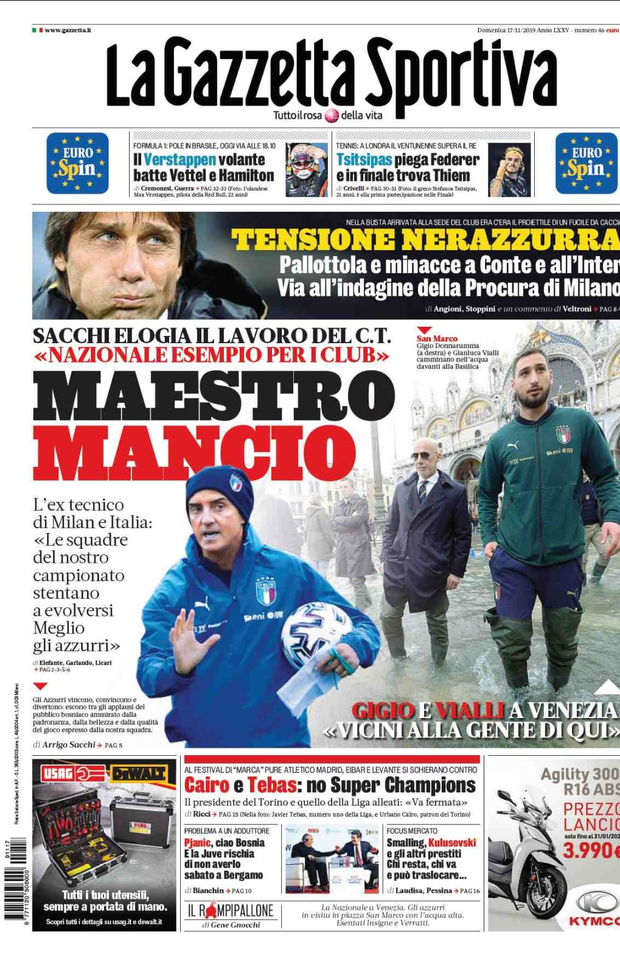 Ecco le prime pagine di oggi, domenica 17 novembre 2019 de 'La Gazzetta dello Sport', 'Corriere dello Sport' e 'Tuttosport'. In primo piano l'Italia che ieri ha fatto visita a Venezia dopo i tristi fatti dei giorni passati. Gli Azzurri di Roberto Mancini cercano contro l'Armenia a Palermo la decima vittoria su 10 gare disputate nelle qualificazioni a Euro 2020, un traguardo mai raggiunto prima. Dell'Italia ha parlato Arrigo Sacchi sulle pagine della rosea. In casa Milan si parla sempre di mercato con Ibrahimovic il nome caldo che può arrivare a gennaio.