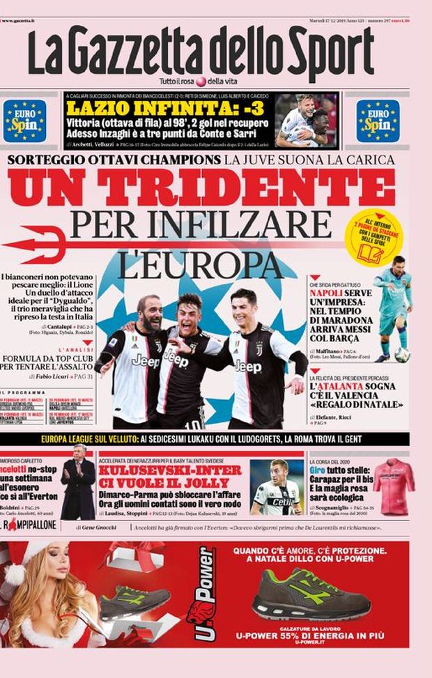 Ecco le prime pagine di oggi, martedì 17 dicembre 2019 de 'La Gazzetta dello Sport', 'Corriere dello Sport' e 'Tuttosport'. In primo piano il sorteggio di Champions League di ieri, con la Juventus che incontrerà il Lione, l'Atalanta il Valencia, e il Napoli giocherà contro il Barcellona, con Lionel Messi che per la prima volta in carriera sarà al San Paolo. A tra poco per tutta la rassegna stampa.
