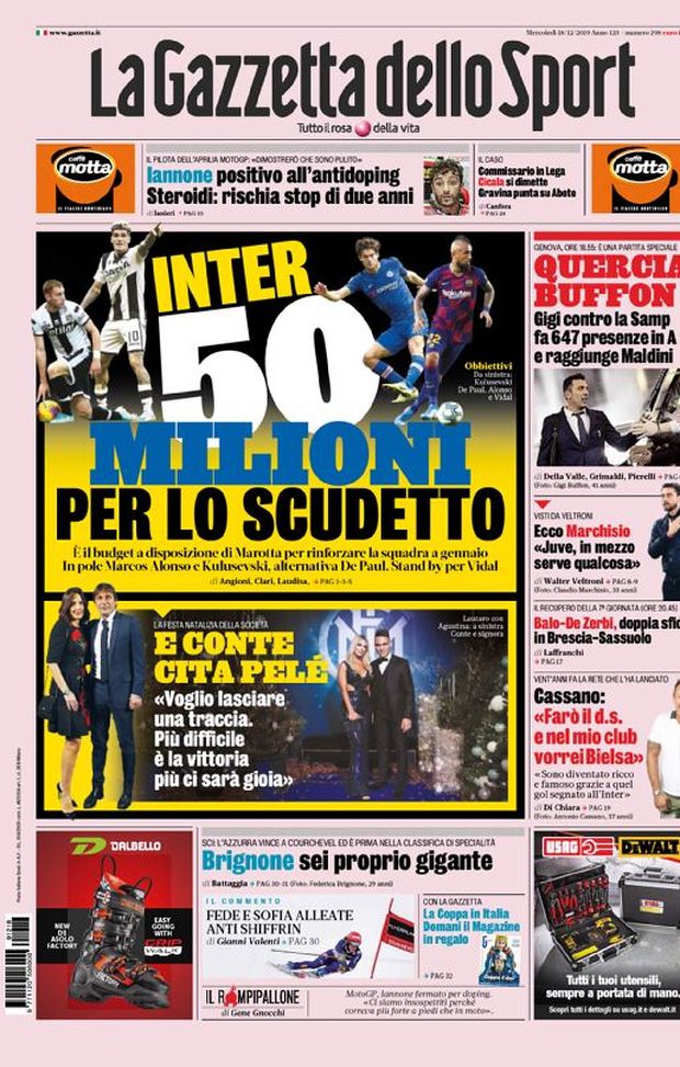 Ecco le prime pagine di oggi, mercoledì 18 dicembre 2019 de 'La Gazzetta dello Sport', 'Corriere dello Sport' e 'Tuttosport'. In primo piano la lotta scudetto tra Juventus e Inter, con i nerazzurri che hanno intenzione di investire nel mercato di gennaio. Spazio anche alle parole di Antonio Conte, che ha rilasciato delle dichiarazioni alla festa di Natale organizzata dalla società. A tra poco per la rassegna stampa completa.