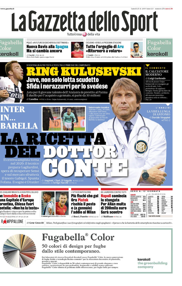 Ecco le prime pagine di oggi, lunedì 25 novembre 2019 de 'La Gazzetta dello Sport', 'Corriere dello Sport' e 'Tuttosport'. In primo piano i risultati della domenica di campionato con la 13^ giornata che si concluderà questa sera con Spal-Genoa. Oggi è anche vigilia di Champions League con Atalanta e Juventus che ospitano Dinamo Zagabria e Atletico Madrid. In casa Milan continua il momento negativo di Piatek, sabato fischiatissimo dal pubblico di San Siro.