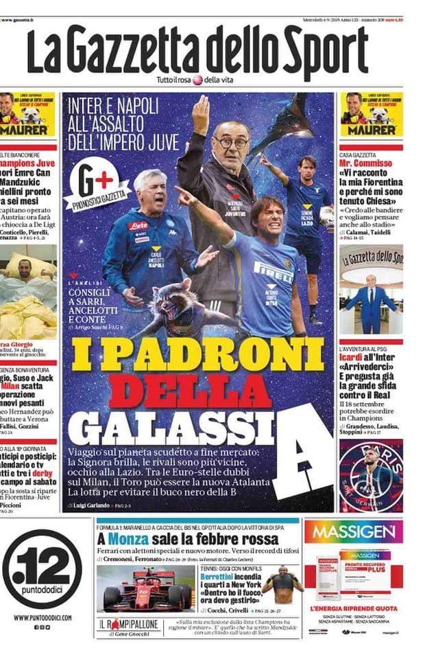 Ecco le prime pagine di oggi, mercoledì 4 settembre 2019 de 'La Gazzetta dello Sport', 'Corriere dello Sport' e 'Tuttosport'. In primo piano la Serie A e il bilancio delle varie squadre dopo la chiusura del mercato: Juventus, Inter e Napoli sembrano indiscutibilmente più avanti rispetto alle altre. In casa Milan, invece, si pensa ai rinnovi di Donnarumma, Suso e Bonaventura. A tra poco per scoprire tutta la rassegna, ovviamente in chiave rossonera.