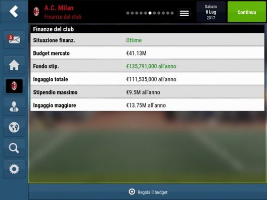 La situazione finanziaria del Milan viene definita 'ottima'. C'è un budget per poter operare in sede di calciomercato, sin da subito, di poco superiore ai 41 milioni di euro; un fondo stipendi di 135 milioni di euro l'anno ed un monte ingaggi di 111 milioni di euro l'anno. Spazio, dunque, per qualche margine di manovra iniziale c'è tutto. Lo stipendio massimo, nelle intenzioni della società, è di 9,5 milioni di euro a stagione, anche se, in rosa, è presente Leonardo Bonucci che, con i suoi 13,75 milioni di euro netti l'anno va ben oltre sopra il previsto.