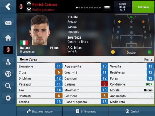 Tutti i giovani prospetti del Milan sono disponibili per la vostra carriera. Come, ad esempio, Patrick Cutrone (14,5 milioni il valore del suo cartellino), ma anche Niccolò Zanellato (1,7 milioni). Una delle regole fondamentali, quando si gioca a Football Manager, è far crescere quanti più talenti possibili, scovarne di nuovi nei settori giovanili, proprio e delle altre squadre, ed individuare sin dai primi passi nuovi, potenziali campioni per la squadra del futuro. Con il Milan, poi, è ancora più stimolante giacché il club rossonero, da qualche anno, sta puntando forte sulla crescita dei ragazzi del suo vivaio e sul loro lancio in Prima Squadra.