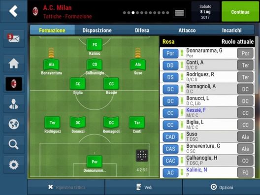 Football Manager 2018 propone, per il Milan, una tattica di base che Vincenzo Montella, nella realtà, ha utilizzato pochissime volte, se non in situazioni di emergenza, nel tentativo, magari, di rimontare delle reti in un match con il Diavolo in svantaggio. Si tratta del 4-2-3-1. Lo schieramento proposto, all'inizio, dai collaboratori e dagli assistenti virtuali del videogioco prevede Gianluigi Donnarumma in porta; una retroguardia composta da Andrea Conti, Alessio Romagnoli, Leonardo Bonucci e Ricardo Rodríguez; Lucas Biglie e Franck Kessè sono i due mediani; Suso, Hakan Çalhanoğlu e Giacomo Bonaventura agiscono nel tridente dei trequartisti alle spalle di Nikola Kalinić.