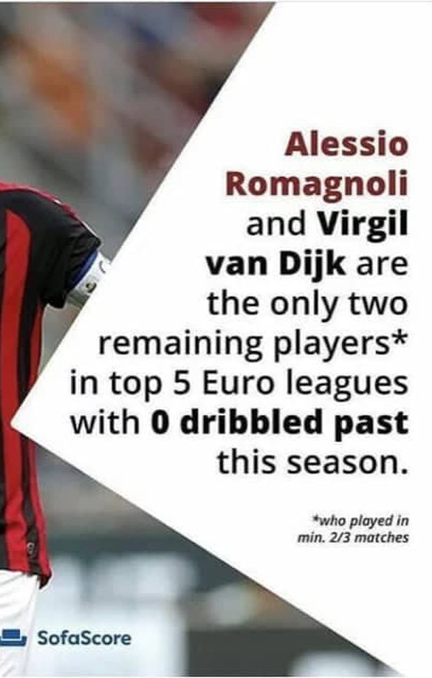 Romagnoli e van Dijk, infatti, sono gli unici due difensori, nei maggiori cinque campionati europei (Premier League, Liga, Bundesliga, Serie A e Ligue 1), tra quelli ad aver giocato almeno i due terzi delle gare complessive, a non aver mai subito un dribbling da un avversario in questa stagione. Chapeau.