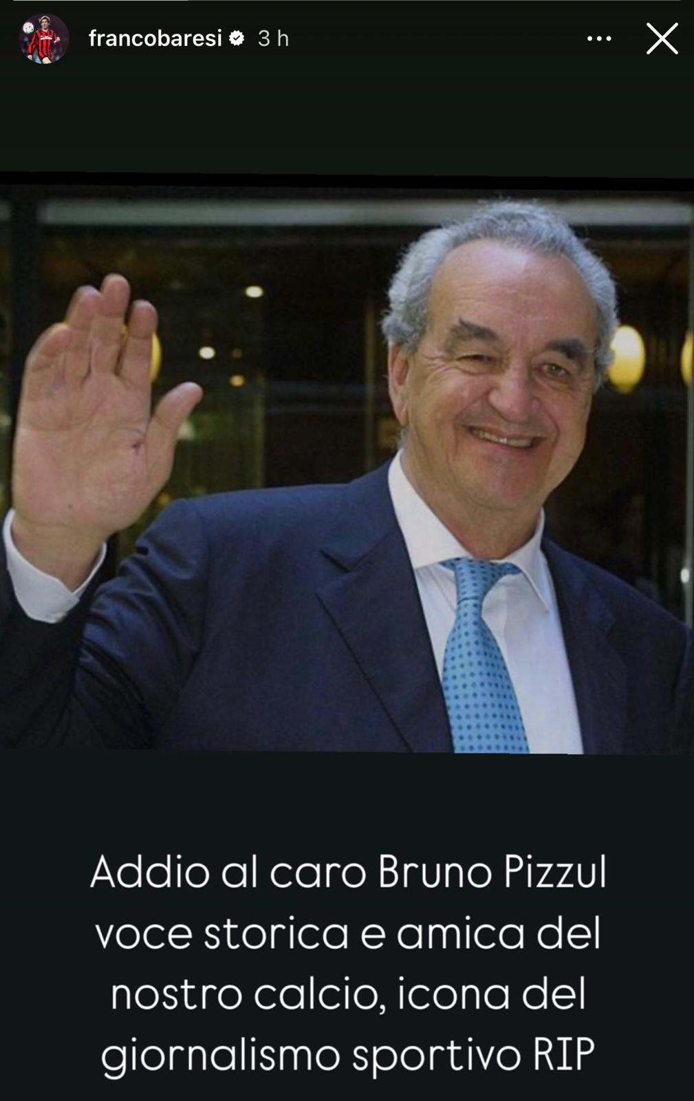 "Addio al caro Bruno Pizzul, voce storica e amica del nostro calcio, icona del giornalismo sportivo. RIP", ha scritto Baresi in una storia sul suo account ufficiale del popolare social network 'Instagram'. LEGGI ANCHE: Abbiati: “Milan, brutto l’anno da club manager. Ma se mi chiamasse ora …” >>>