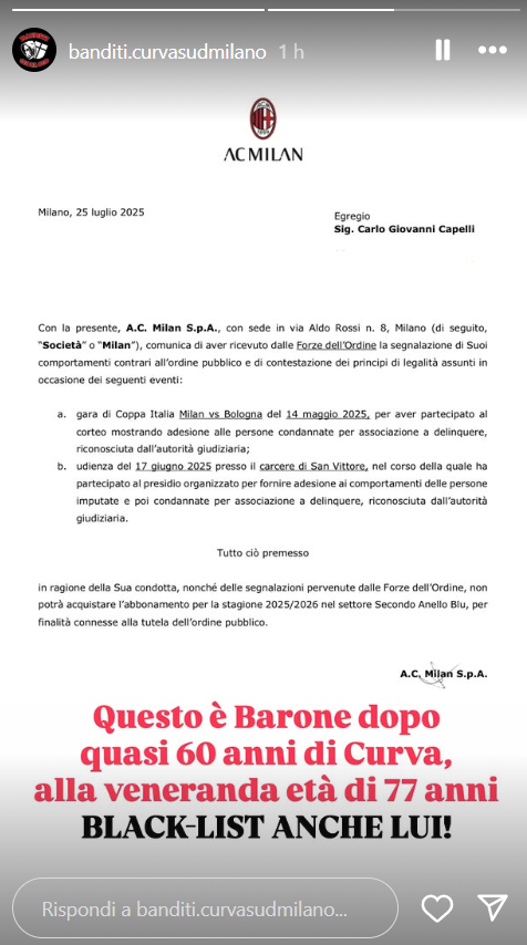 "Questo è il Barone dopo quasi 60 anni di Curva, alla veneranda età di 77 anni. Black-List anche lui!". Come detto, la Curva Sud non ha partecipato a Milan-Bari e la questione potrebbe andare per le lunghe.