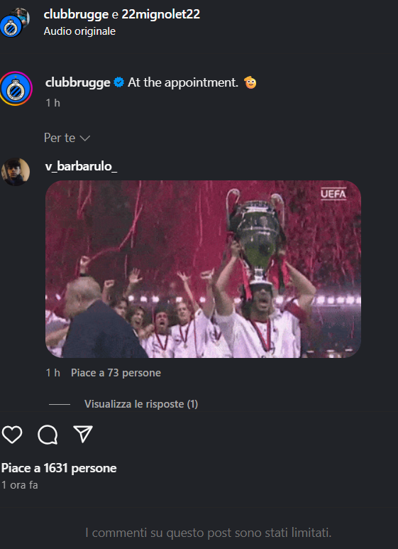 —Sotto i post su Instagram del Bruges, molti tifosi del Milan hanno commentato in merito alla trattativa Ardon Jashari: "Free Jashari" è il commento più usato, ma non solo. Tante lamentale, gif satiriche e ex leggende del Milan con la Champions League. Un vero e proprio caos social, tanto che il Bruges ha dovuto limitare i commenti sui propri profili.