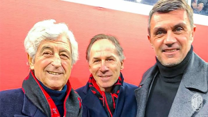 Oggi tanti personaggi storici presenti a San Siro per i 120 anni del Milan. Non potevano mancare i tre capitani. Foto su Twitter.