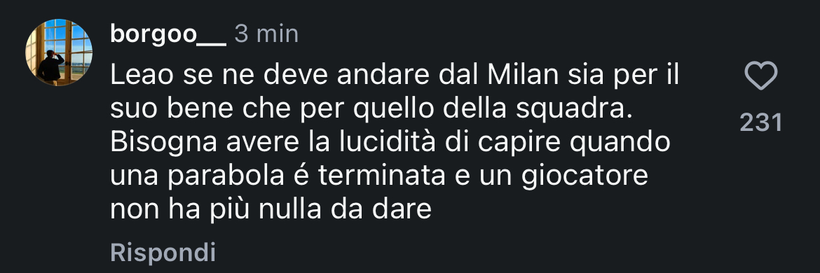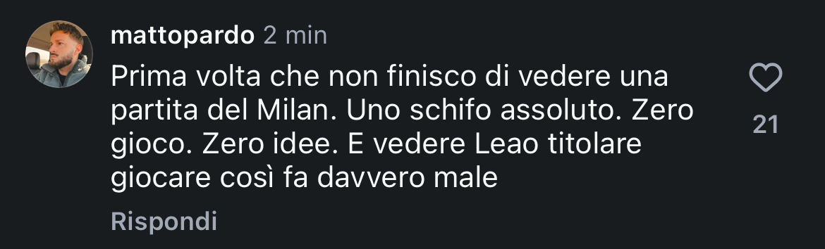 "Prima volta che non finisco di vedere una partita del Milan. Uno schifo assoluto. Zero gioco. Zero idee. E vedere Leao titolare giocare così fa davvero male"