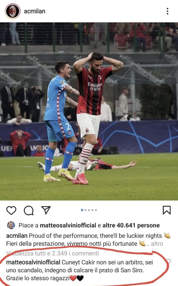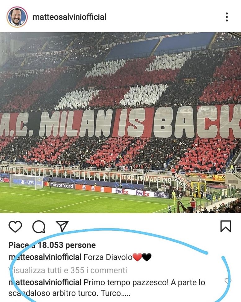 "Primo tempo pazzesco - ha scritto Salvini su Milan-Atlético Madrid -. A parte lo scandaloso arbitro turco. Turco ...". Il numero uno della Lega, poi, ha rincarato la dose in seguito, commentando anche un post dello stesso Milan su 'Instagram', spiegando come, a lui, l'arbitro non sia davvero piaciuto.