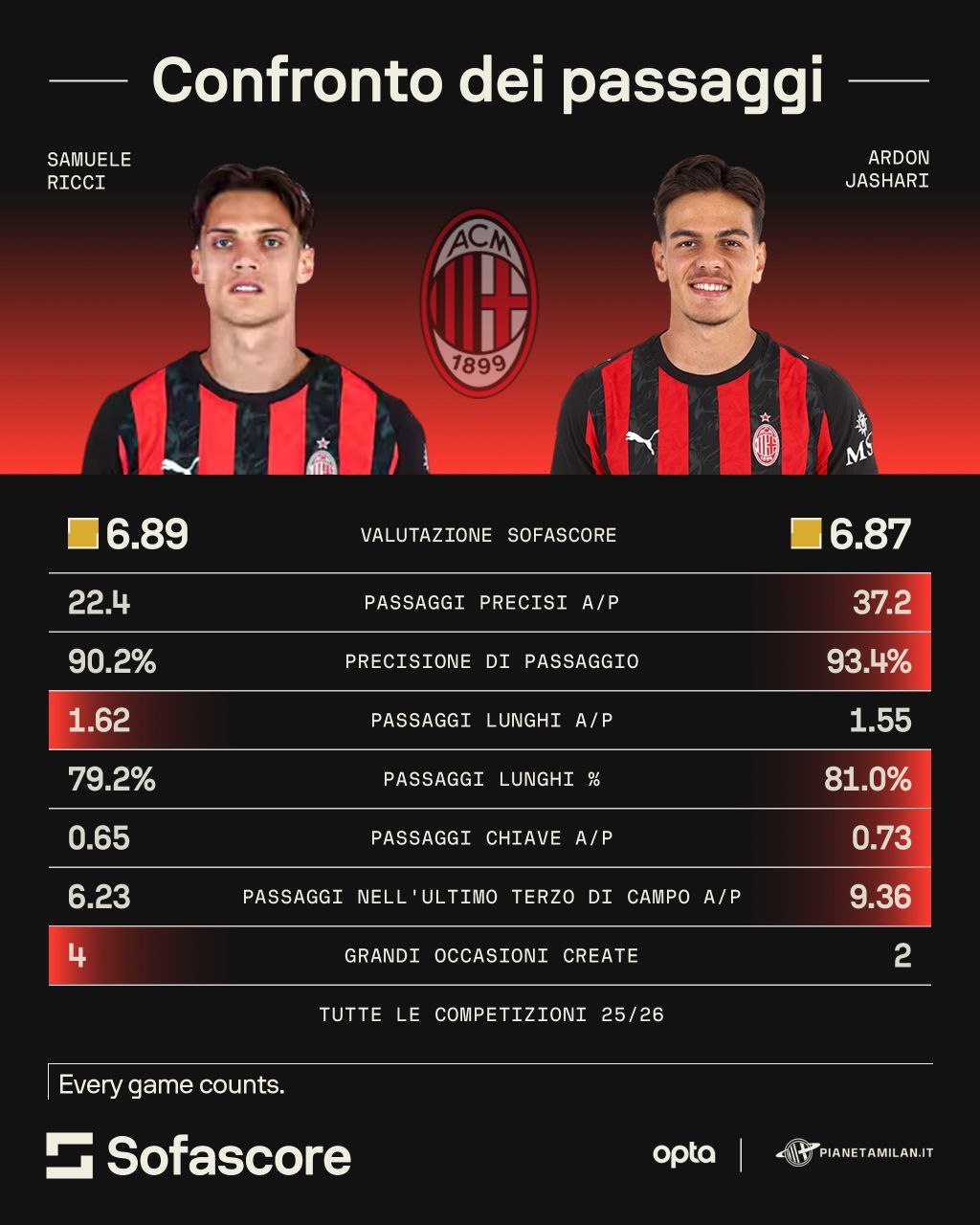 Abbiamo voluto valutare i passaggi dei due: in quasi tutte le caratteristiche è Jashari in netto vantaggio su Ricci con le grandi occasioni create e i passaggi lunghi di media di poco a favore dell'ex Torino. L'ex Bruges 'vince' il confronto sui passaggi precisi di media, sulla precisione dei passaggi, sulla percentuale dei passaggi lunghi, sui passaggi chiave di media e sui passaggi nell'ultimo terzo di campo.